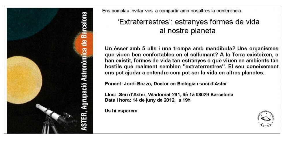 | Conferència “EXTRATERRESTRES" DE LA TERRA : ESTRANYES FORMES DE VIDA AL NOSTRE PLANETA” a càrrec de Jordi Bozzo, Doctor en Biologia i soci d´ Aster. Un esser amb 5 ulls i una trompa amb mandibula? Uns organismes que viuen ben confortables en el salfumant? A la terra existeixen, o han existit, formes de vida tan estranyes o que viuen en ambients tan hostils que realment semblen "extraterrestres". El seu coneixement ens pot ajudar a entendre com pot ser la vida en altres planetes. Ponent: Jordi Bozzo, doctor en Biologia i soci d´Aster. 19.00 hores Per accedir a l´invitacio feu clic aqui |