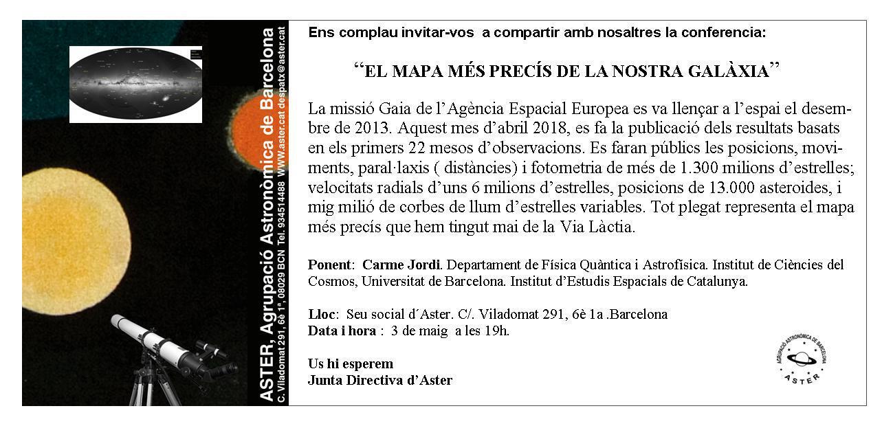 "La missió Gaia de l’Agència Espacial Europea es va llençar a l’espai el desembre de 2013. Aquest mes d’abril 2018, es fa la publicació dels resultats basats en els primers 22 mesos d’observacions. Es faran públics les posicions, moviments, paral·laxis (distàncies) i fotometria de més de 1.300 milions d’estrelles; velocitats radials d’uns 6 milions d’estrelles, posicions de 13.000 asteroides, i mig milió de corbes de llum d’estrelles variables. Tot plegat representa el mapa més precís que hem tingut mai de la Via Làctia."
